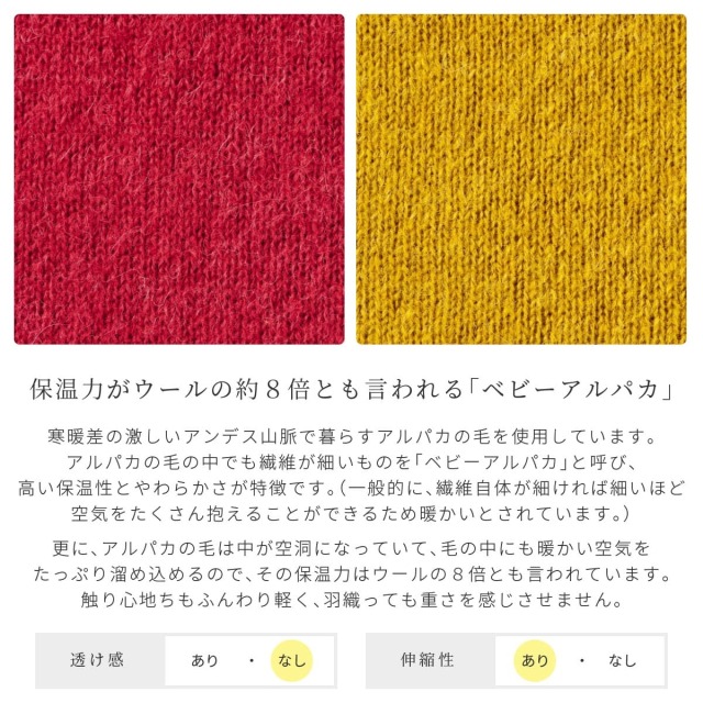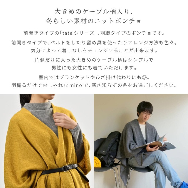 こちらのminoは前開きタイプの「tateシリーズ」、羽織タイプのポンチョです。 前開きタイプで、ベルトをしたり留め具を使ったりアレンジ方法も色々。気分によって着こなしをチェンジすることが出来ます。 片側だけに入った大きめのケーブル柄はシンプルで男性にも女性にも着ていただけます。 室内ではブランケットやひざ掛け代わりにも◎。暖かさはもちろん、羽織るだけでおしゃれなminoで、寒さ知らずの冬をお過ごしください。 付属のニットヒモを使い、丸めて持ち運ぶことができます。ニットヒモのカラーは届いてからのお楽しみ。丸くてかわいいのでお部屋においておくだけでオシャレなインテリアにも◎ ※写真は別の商品(mino-winter-03)です。 サイズは「フリーサイズ」のみです こちらのminoには、寒暖差の激しいアンデス山脈で暮らすアルパカの毛を使用しています。アルパカの毛の中でも繊維が細いものを「ベビーアルパカ」と呼び、高い保温性とやわらかさが特徴です。(一般的に、繊維自体が細ければ細いほど空気をたくさん抱えることができるため暖かいとされています。) 更に、アルパカの毛は中が空洞になっていて、毛の中にも暖かい空気をたっぷり溜め込めるので、その保温力はウールの8倍とも言われています。触り心地ちもふんわり軽く、羽織っても重さを感じさせません。 毛48% / アルパカ37% / ナイロン15%