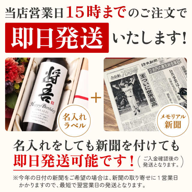 会社の上司が還暦を迎えられたので、部署一同からお祝いとしてこちらのワインを贈りました。注文時に名前の漢字を一文字間違えてしまい、修正のお願いをしたところ快く引き受けてくださり助かりました。総務代表で渡したのですが、喜んでくれるかすごく緊張しました。ラベルのインパクトもさることながら、入社した日の日付の新聞にも大変感動していただけました。他のスタッフも食い入るように見ていて、これを選んで間違いなかったなと確信し、同時にとてもホッとしました。思った以上に喜んでくれたので私も嬉しかったです。