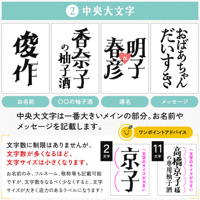 中央はお名前だけでなくメッセージも可能です。文字数に制限はありませんが、文字数が多くなるほど文字サイズは小さくなります。