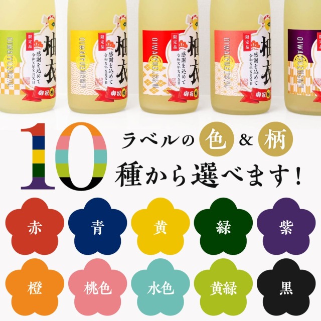 お好みや用途に合わせてカスタマイズできるように、ラベルの色と柄を10種ずつご用意しました。柄は日本伝統の吉祥文様。手にした人の幸せを願う縁起の良い模様です。ラッキーカラーやお祝いのテーマカラーに幸せを願う柄を合わせれば、お祝いの日をより一層鮮やかに盛り上げる柚子酒ラベルの完成です。
