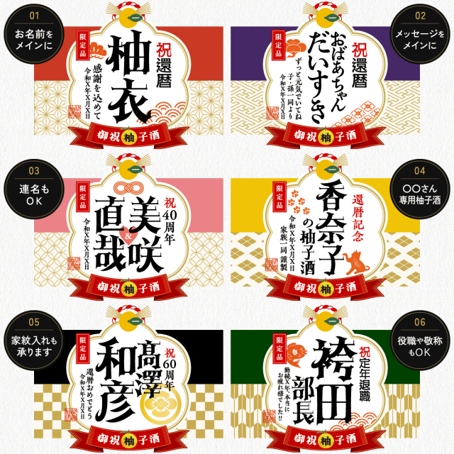 ラベルにはお名前やメッセージなど、お好きな内容が自由に入れられます。色や柄もお選びいただけますので、選ぶときのワクワク感、箱を開けるときのドキドキ感が満載の、贈る方も受け取る方も楽しめる柚子酒ギフトです。