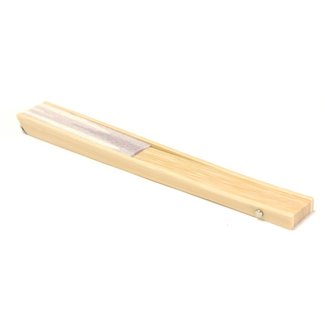 扇子の骨組み部分を「扇骨」と呼び、その中でも両端にある厚くて丈夫な骨を親骨と言います。小千谷縮の扇子にも親骨は、着物の袖をイメージして先端をカット。ディティール面でもこだわります。